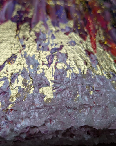 Blattgold, Strukturpaste, Acrylfarben, Bergkristallpulver (1 mm), Flusssand, Goldglitzer